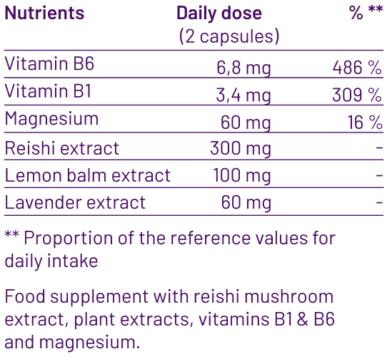Reishi + Lavendel + Melisse wirken gezielt auf die Übererregung im Nervensystem und senken die Signalübertragung von Stress-Botenstoffen. Ergebnis: Ruhe im Kopf, nicht nur kurzfristige Entspannung.