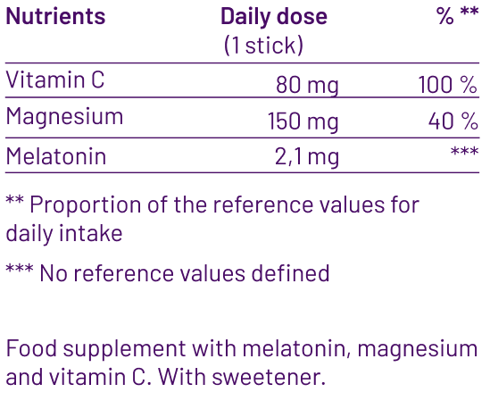 Take the contents of one stick in the evening before going to bed. Please follow the recommended dosage to ensure the positive effects of melatonin.