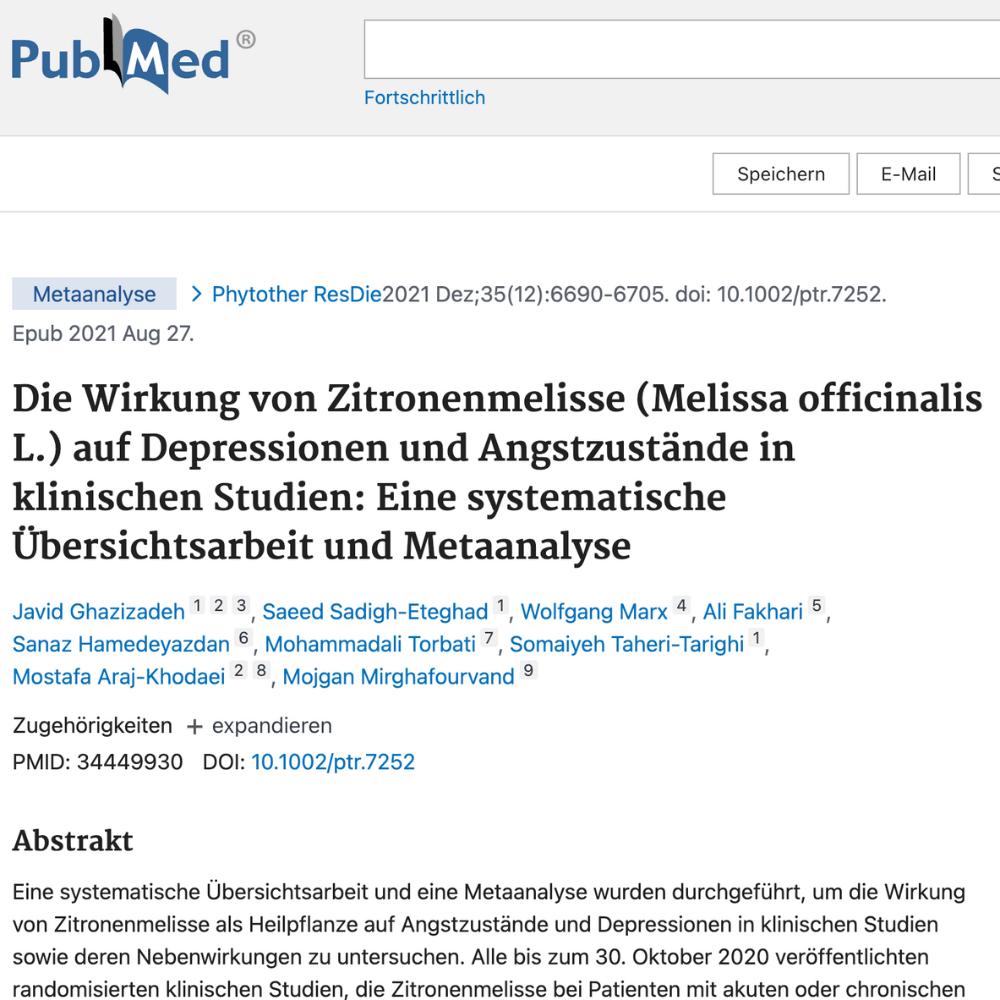Die Metaanalyse wertete mehrere randomisierte, placebokontrollierte Studien mit Zitronenmelisse aus und fand signifikant niedrigere Angst-Scores im Vergleich zu Placebo.
