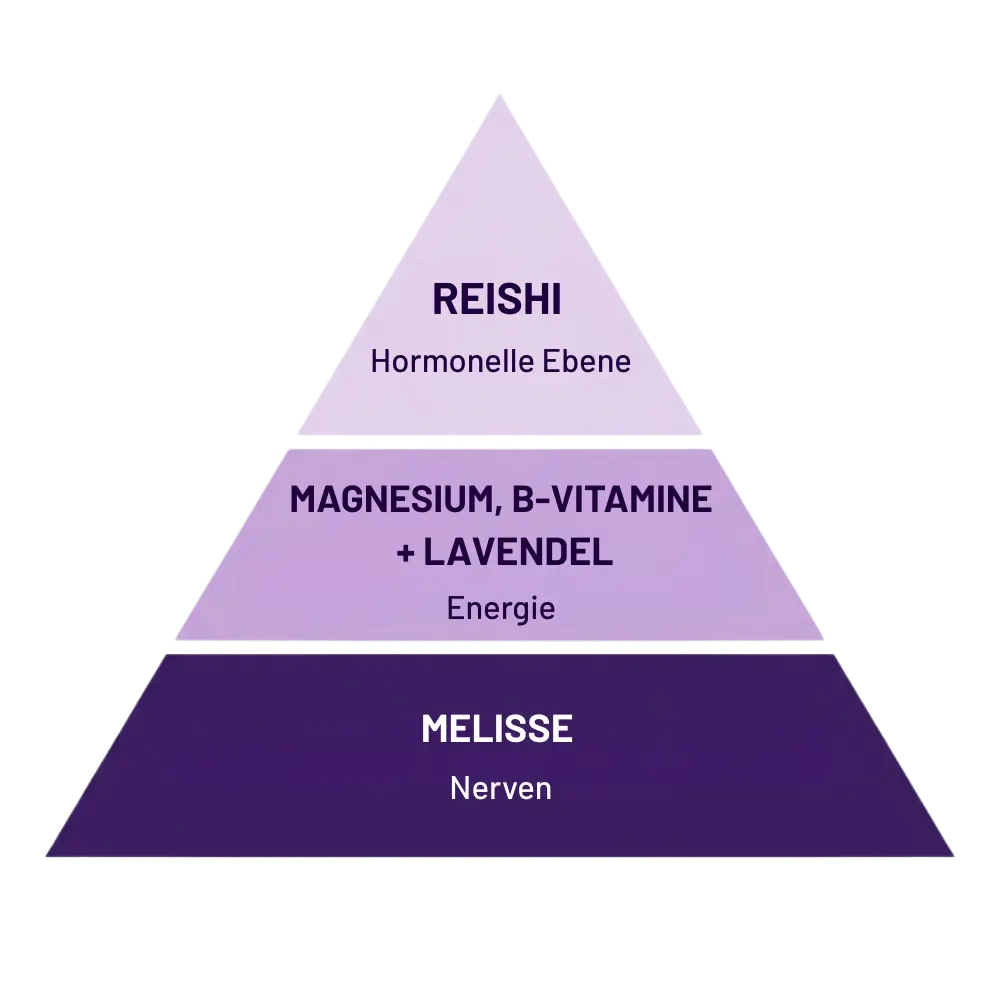 Reishi + Lavendel + Melisse wirken gezielt auf die Übererregung im Nervensystem und senken die Signalübertragung von Stress-Botenstoffen. Ergebnis: Ruhe im Kopf, nicht nur kurzfristige Entspannung.
